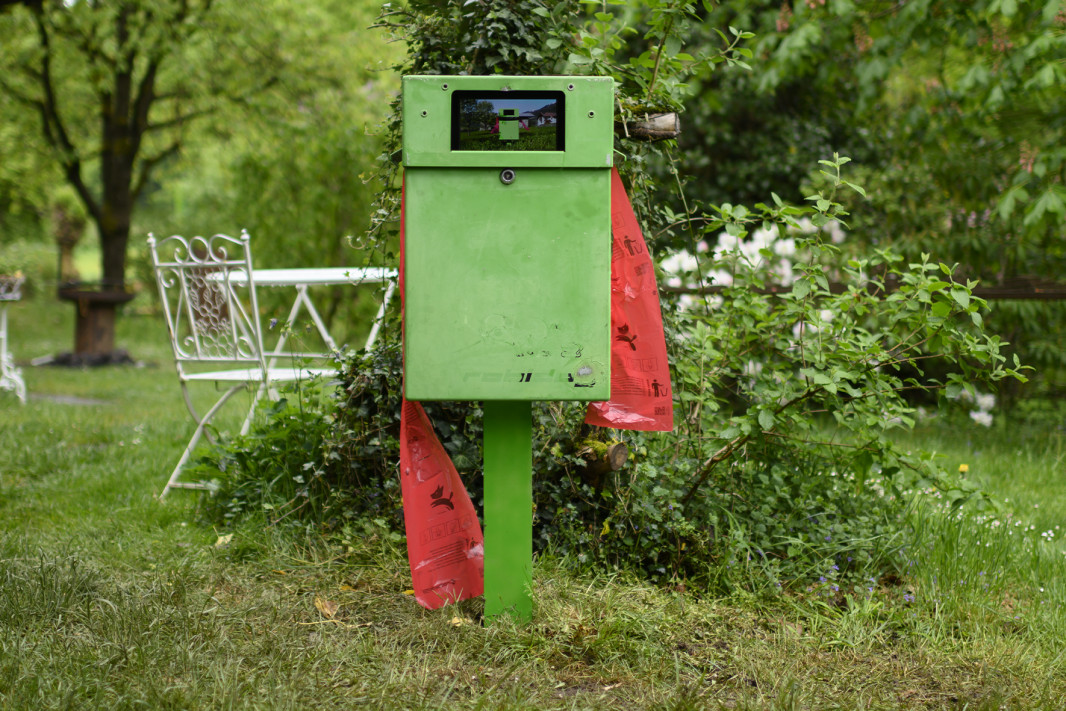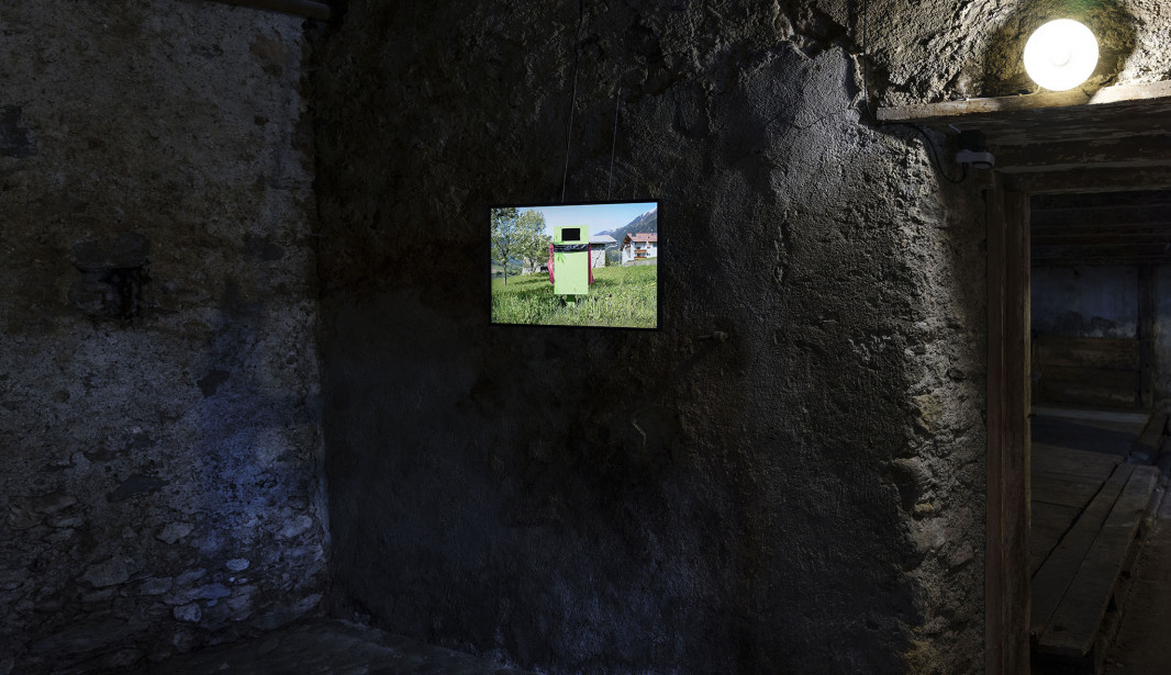 Robi tanzt, 2020MP4, 16:9, video loop, 3‘05‘‘, stereo. Musik: Claude Meier«Last Exit Eden 2», 2021, Sta Maria«ALLES IM GRÜNEN BEREICH?», 2020, Galerie WeiertalIm Schweizer Dorf Santa Maria nahe der italienischen Grenze steht, wie an vielen anderen Orten in der Schweiz auch, ein Robidog. Idyllisch und malerisch die Landschaft, stört er das schöne Bild – und entwickelt im Video doch eine ganze eigene Poesie und Ausdruckskraft. Die roten Plastiksäckchen wehen im Wind, melancholisch, träumerisch, im Augenblick verhaftet. Dem gegenüber steht die Funktionalität des Robidogs als Zeichen einer sauberen Schweiz, wie auch als Mahnung und giftgrün, unübersehbarer Hinweis an hundeausführende Spaziergänger/innen. Der winkende und tanzende Robidog hat auch etwas humorvolles, etwas leichtes und widerspricht damit seiner eigenen reinen Funktionalität. Verstärkt wird diese Leichtigkeit im Video durch die Musik, die die Bewegungen und den Tanz aufnimmt und das spielerische Moment manifestiert. Der Robidog erhält durch das Filmen und die Musik eine besondere Aufmerksamkeit die er im Alltag sonst nicht erfährt und es scheint fast, als führe er den Tanz extra für die Filmerin und nun für die Betrachter/innen dieses Videos auf. Es ist das absurde im Alltäglichen was Johanna Bossart immer wieder fasziniert. Schon in früheren Arbeiten spürt sie diesen Momenten und Gegenständen nach und bindet diese in ihre künstlerischen Arbeiten ein. Indem sie alltägliche Gegenstände wie den Robidog in einem neuen Kontext platziert, führt sie uns als Betrachtenden vor Augen, wie seltsam Objekte mitunter anmuten. Text: Ariane Roth